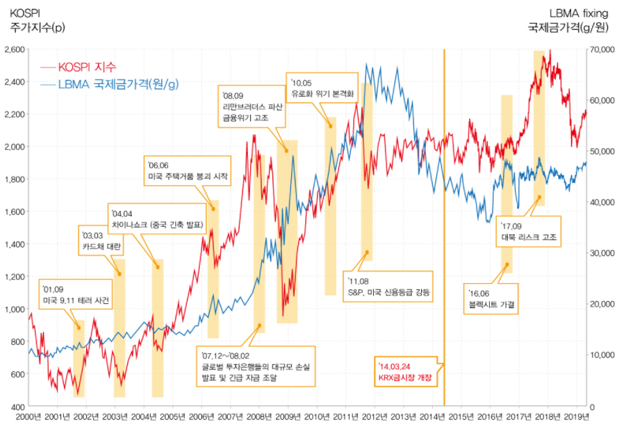 - 과거부터 현재까지 금 가격 - KOSPI지수와 LBMA 국제금가격(원/g)