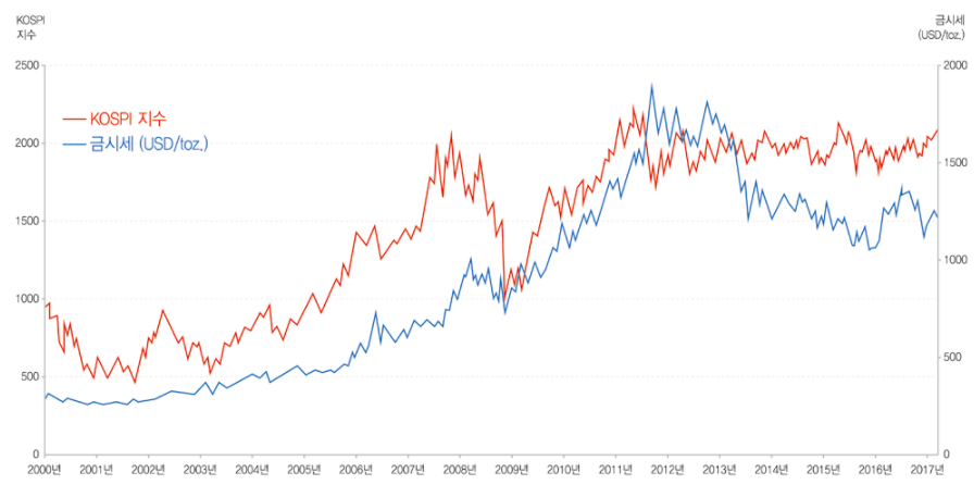 - 과거부터 현재까지 금 가격 -KOSPI 지수와 금시세(USD/toz.)