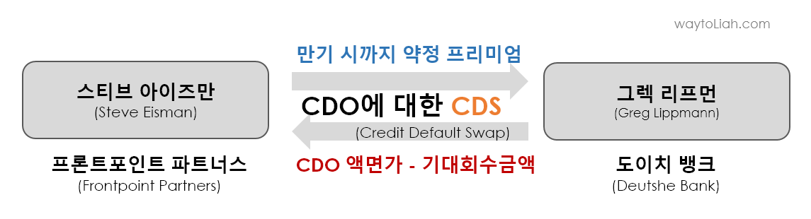 그렉 리프먼(극 중 자레드 베넷)은 도이치 뱅크(Deutsche Bank)의 트레이더로, 도이치뱅크는 리프만에게 모기지 저당 채권(MBS: Mortgage Backed Security)와 CDO, CLO 등 구조화 채권 상품의 트레이딩을 맡기게 되고, 리프먼은 2002년 미국의 부동산 버블에 편승한 MBS 채권거래 및 중개 수수료를 통해 많은 수익을 올린다.