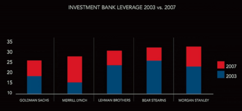 거품경제 기간 동안 은행은 엄청난 돈을 빌렸고 많은 융자를 받아 CDO를 창출했다. 은행의 보유 자본과 융자 자본의 비율을 '레버리지(Leverage)'라고 하는데, 빚이 많을수록 '레버리지'가 높아진다. 2004년, 골드만 삭스 CEO 헨리 폴슨은 증권거래위원회가 레버리지 비율을 낮추도록 로비했고 은행은 더 많은 돈을 끌어다 쓰게 된다.