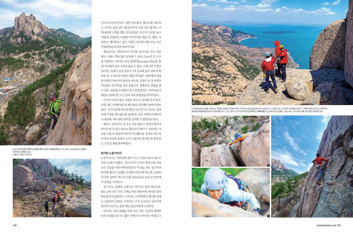황산리지는 전반적으로 무난한 난이도를 가져, 적은 볼트 수에도 부담 없이 등반할 수 있다. 110m의 긴 구간을 자랑하는 3피치는 러닝 빌레이(Running Belay)를 통해 이동해야 등반 시간을 줄일 수 있다. 크랙 시작 지점인 4피치는 빌레이 옵션 볼트가 1개 설치돼 있어 편하게 확보를 볼 수 있으나 등반이 제법 까다롭다. 레이백과 재밍을 적절히 섞어가며 올라야 하는데, 살결이 날 선 바위의 까슬함이 손가락을 타고 온몸으로 전해지는 경험을 할 수 있다. 요령을 부려볼까 잠시 망설였지만, 까마득한 선배들이 빌레이를 보고 있어 이내 요령일랑 접어두었다.
