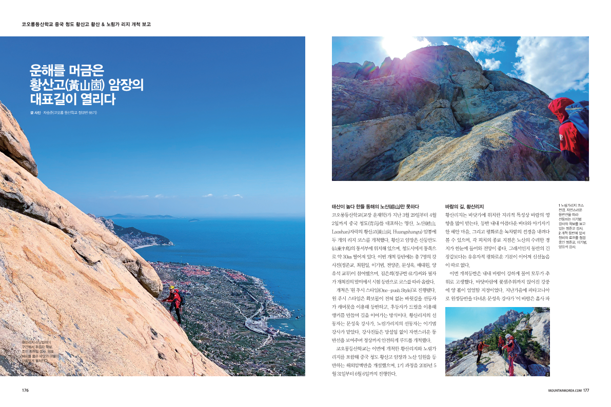 코오롱등산학교(교장 윤재학)가 지난 3월 29일부터 4월 2일까지 중국 청도(靑島)를 대표하는 명산, 노산(崂山, Laoshan)자락의 황산고(黃山崮, Huangshangu) 암봉에 두 개의 리지 코스를 개척했다. 황산고 암장은 산둥반도(山東半島)의 동서부에 위치해 있으며, 청도시에서 동쪽으로 약 30km 떨어져 있다. 이번 개척 등반에는 총 7명의 강사진(정준교, 최원일, 이기범, 전양준, 문성욱, 배대원, 양유석 교무)이 참여했으며, 김은희(정규반 61기)씨와 필자가 개척진의 말미에서 시험 등반으로 코스를 따라 올랐다.