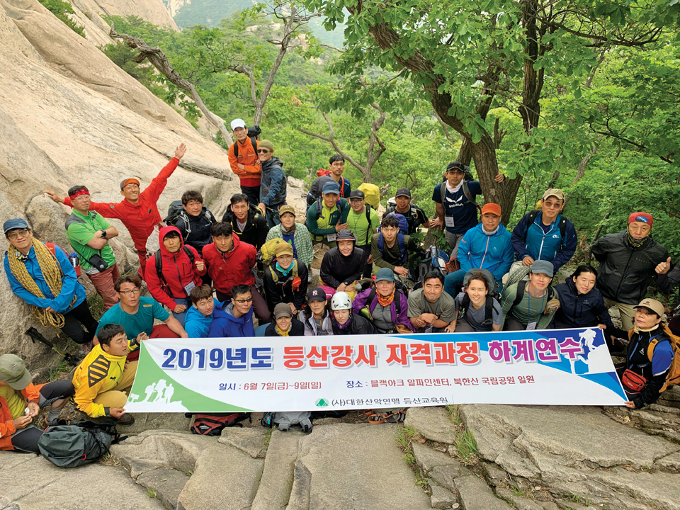 대한산악연맹 등산교육원(원장 남선우)은 6월 7~9일, 서울 우이동 블랙야크 알파인센터와 북한산에서 2019년 등산강사 자격과정 하계연수를 실시했다. 모두 29명의 연수생이 참가했으며, 등반 경력 5년 이상의 베테랑 등반가들이 등산강사를 목표로 뜨거운 열정을 보이며 과정에 임했다.