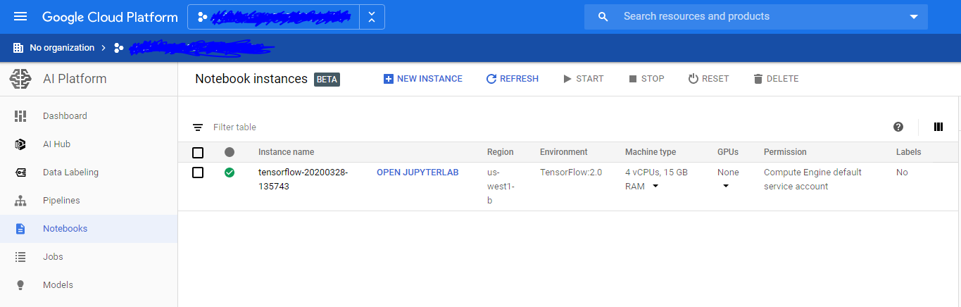 1. 탐색 메뉴에서 > AI Platform > Notebooks 를 선택