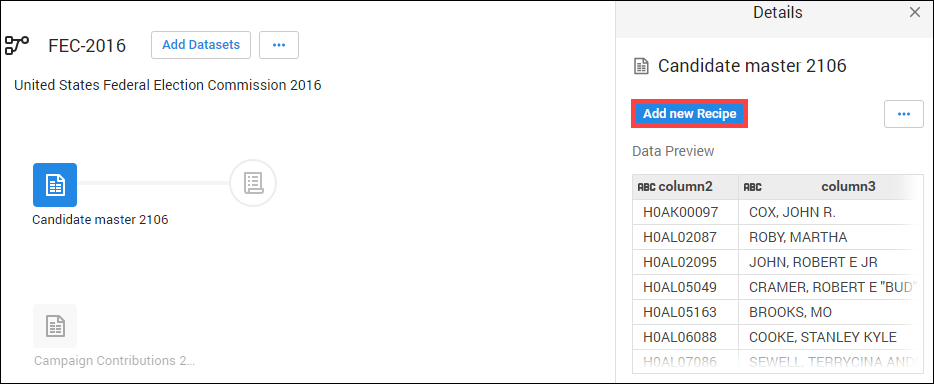 1. 기본적으로 Candidate Master 2016 데이터세트가 선택됨. 오른쪽 창에서 Add New Recipe(새 레시피 추가) 클릭