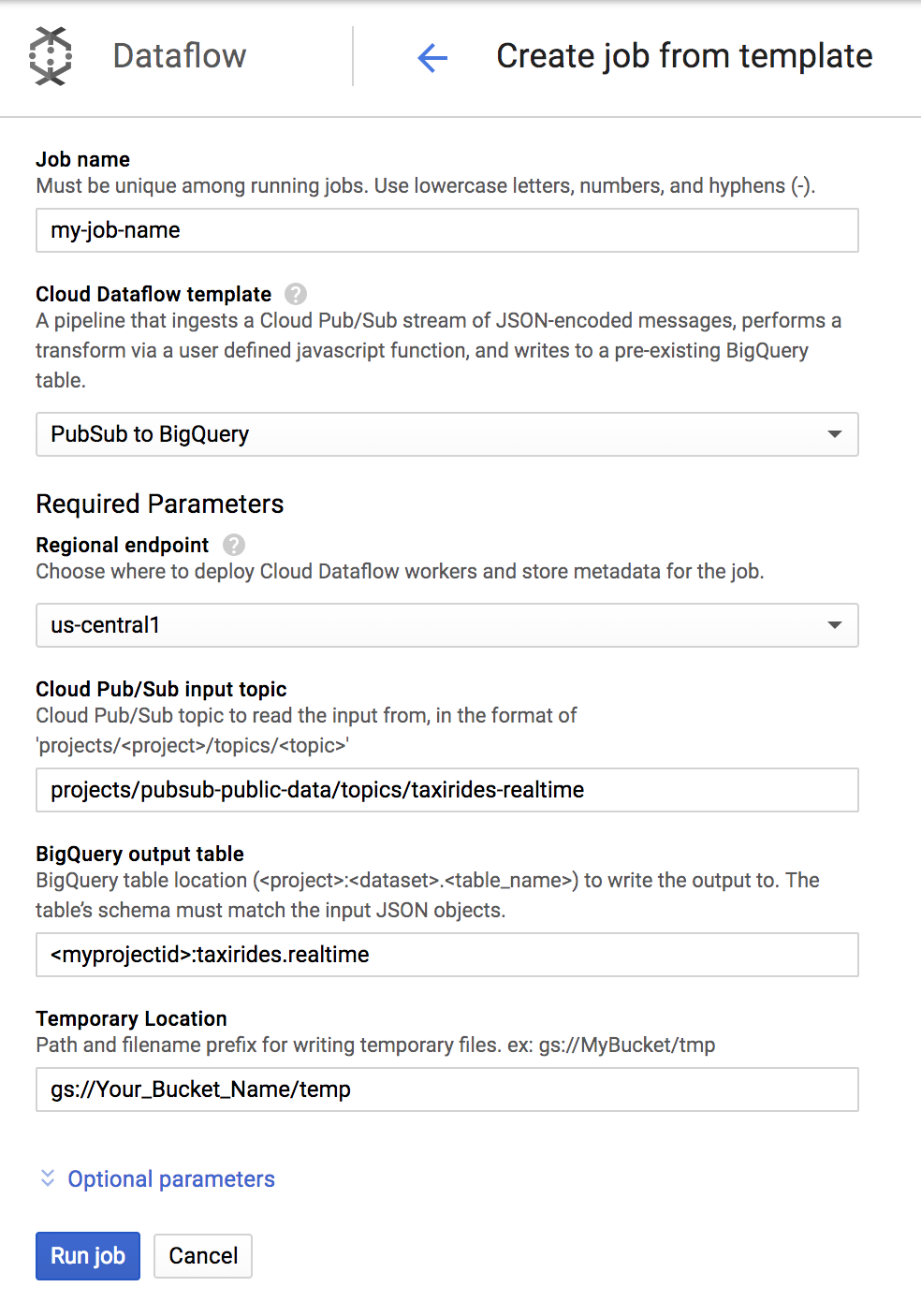 - Cloud Dataflow 템플릿에서 Cloud Pub/Sub Topic to BigQuery( BigQuery에 대한 Cloud Pub/Sub 주제) 템플릿 선택