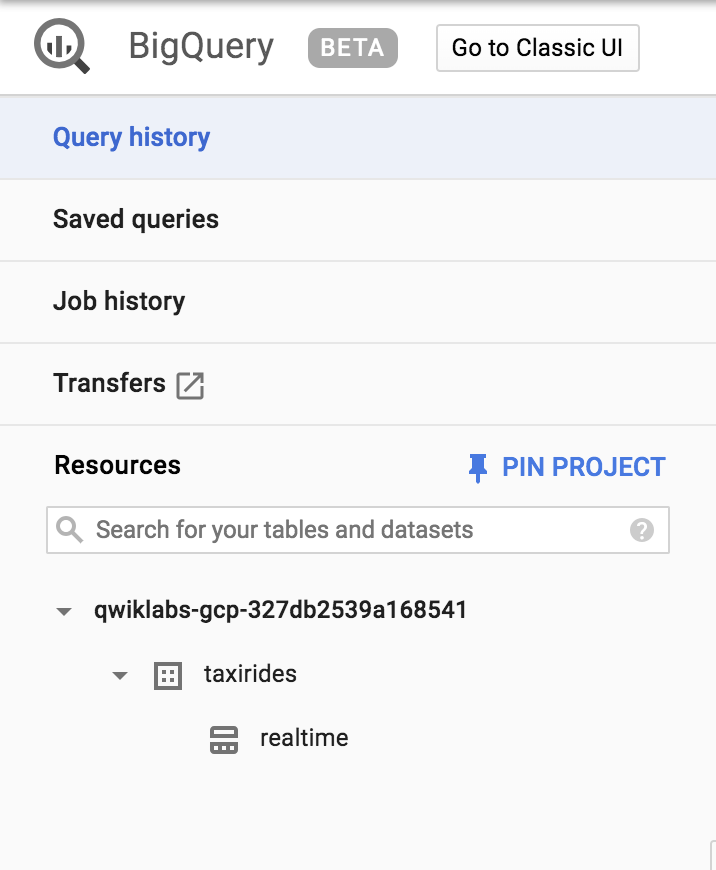 - BigQuery UI가 열리면 프로젝트 이름 아래에 taxirides 테이블이 추가되고 그 아래에 realtime 테이블이 표시됨