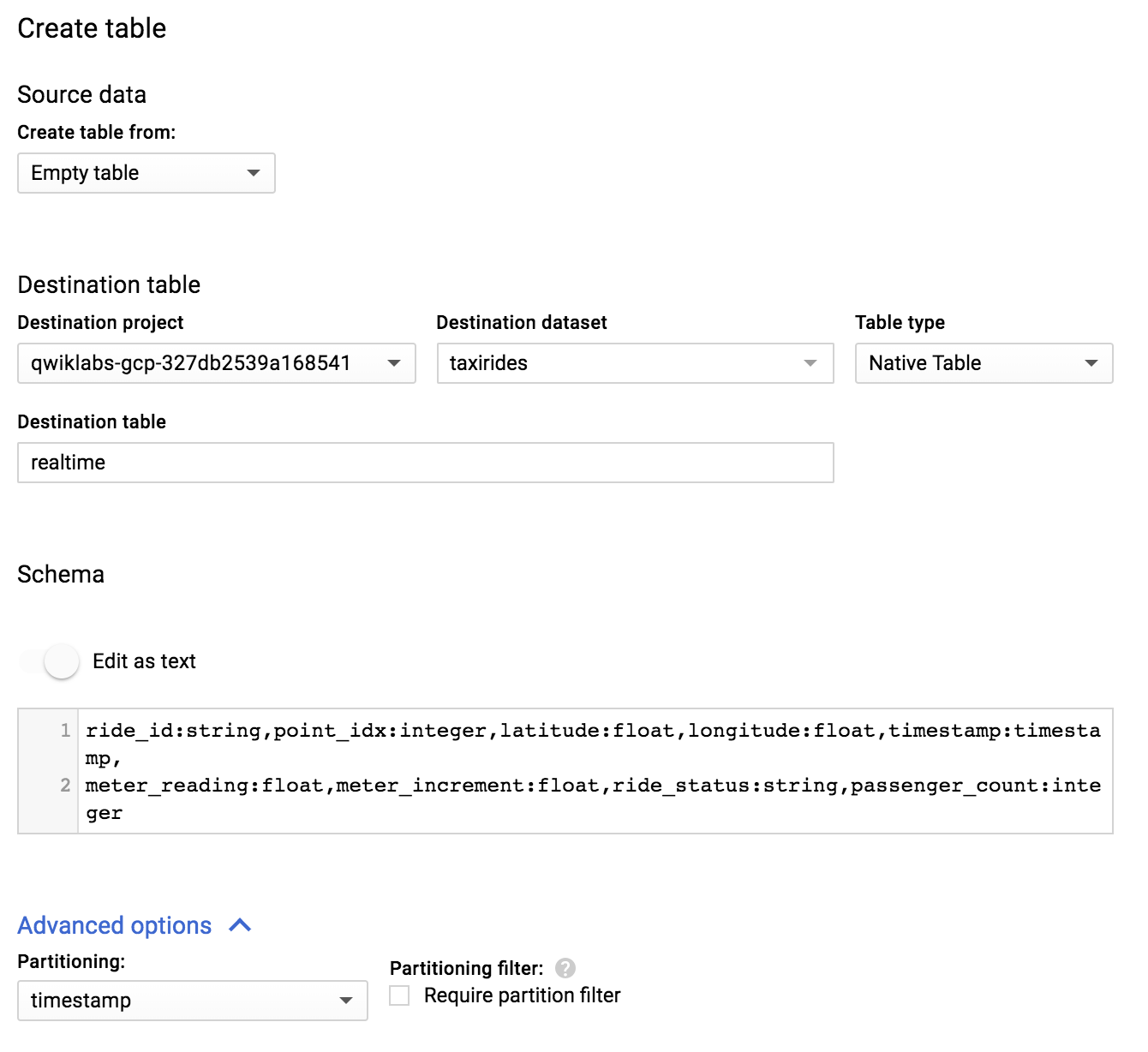 Table 'myprojectid:taxirides.realtime' successfully created