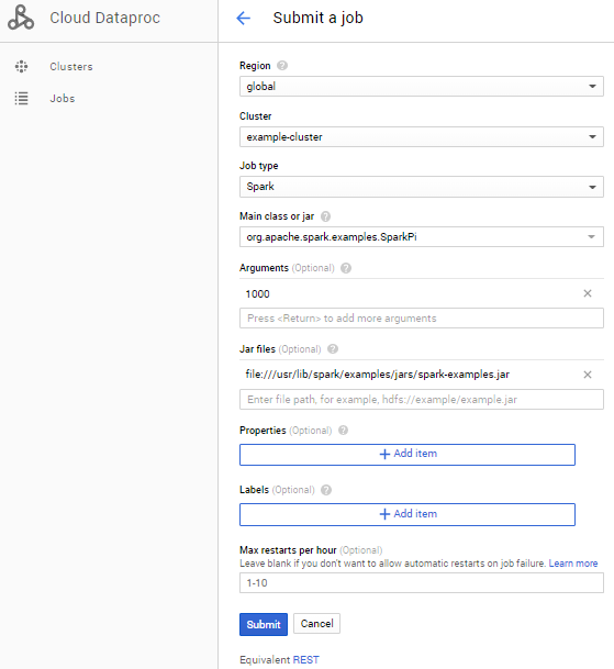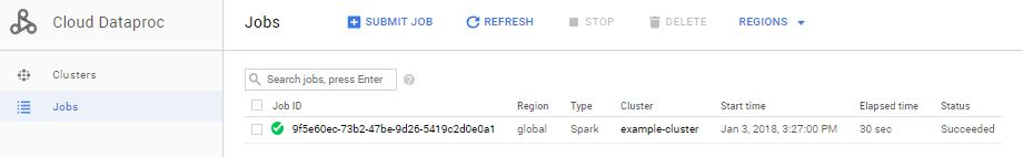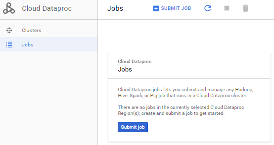 - 왼쪽 창에서 작업을 클릭하여 Dataproc의 작업 보기로 전환한 다음 작업 제출 클릭