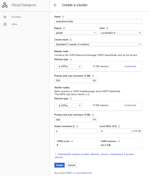 - Cloud Platform Console에서 탐색 메뉴 > Dataproc > 클러스터 선택 > 클러스터 만들기 클릭