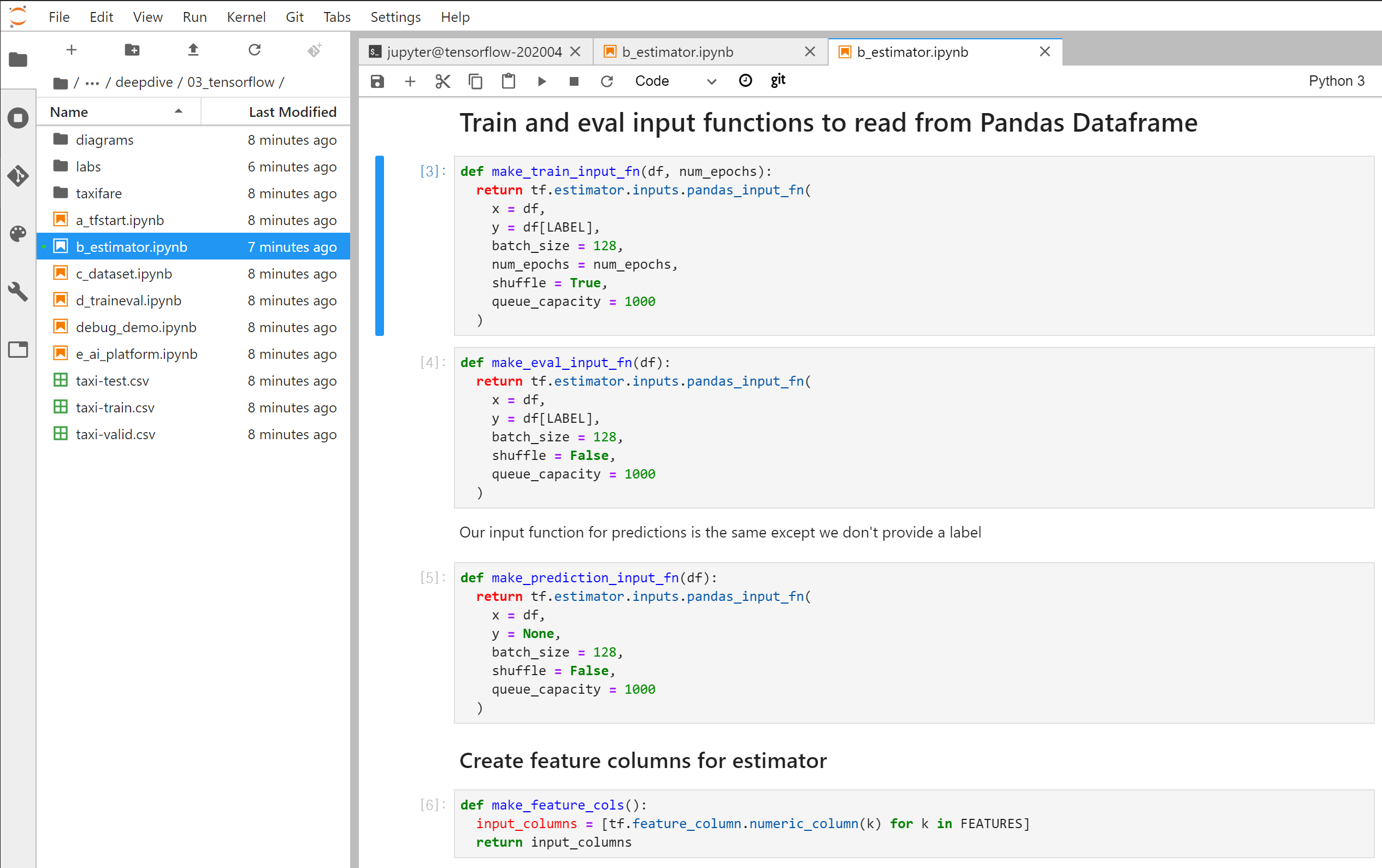 1. 노트북 패널에서 training-data-analyst > courses > machine_learning > deepdive > 03_tensorflow > labs > b_estimator.ipynb 선택