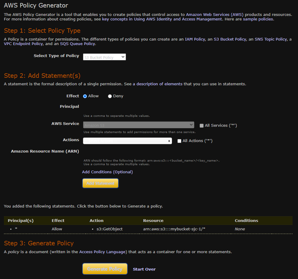 - Select Type of Policy : S3 Bucket Policy