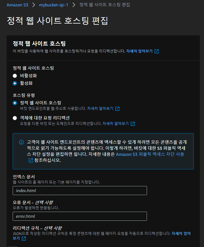 - 정적 웹사이트 호스팅 (Static website hosting) > 활성화 (Enable)