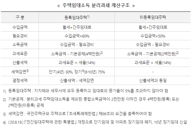 - 등록임대주택 : 세무서와 지자체에 모두 등록하고 임대보증금·임대료의 증가율이 5%를 초과하지 않아야 함