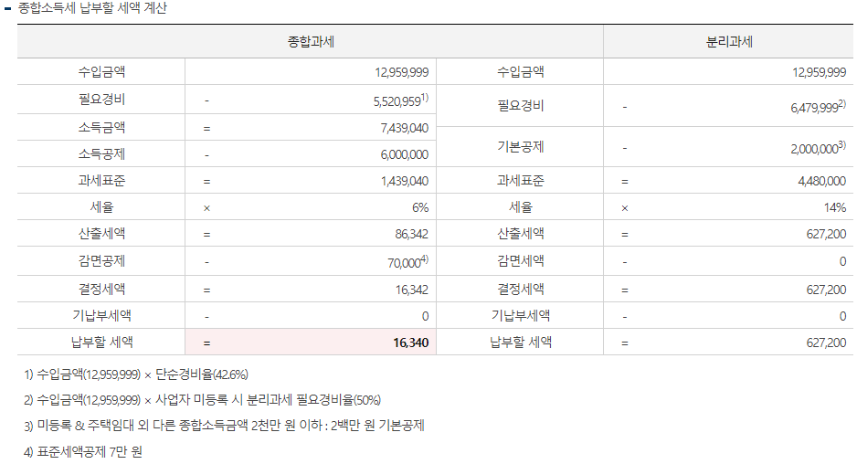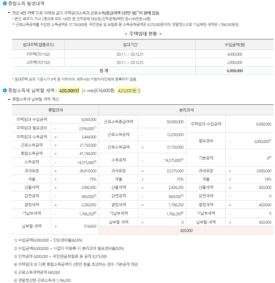 - 홈택스 (www.hometax.go.kr) > 세금종류별 서비스 > 세금모의계산 > 주택임대소득 종합·분리과세 예상세액 비교하기(2020년 세액비교)