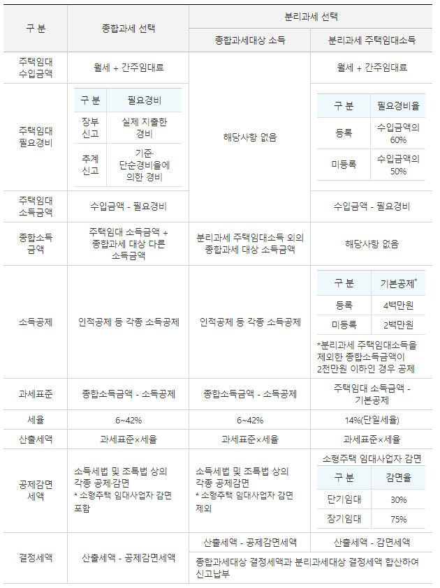 - 주택임대소득만 분리과세(세율 14%)하는 방법과 종합과세하는 방법 중 선택하여 신고할 수 있습니다.