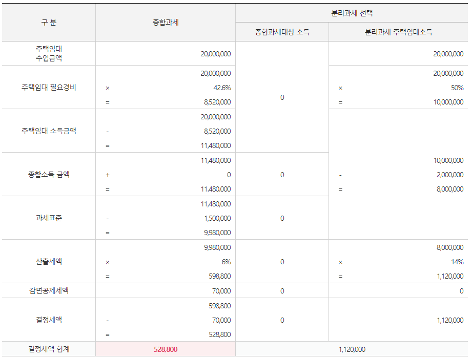 - 홈택스 (www.hometax.go.kr) > 세금종류별 서비스 > 세금모의계산 > 주택임대소득 종합·분리과세 예상세액 비교하기(2020년 세액비교)