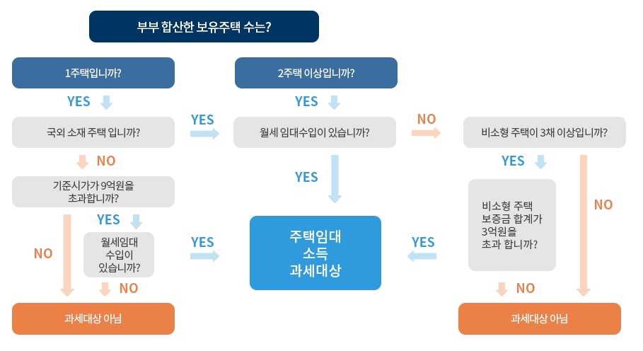 | 3주택 이상 | - 모든 월세 수입 - 비소형주택 3채 이상 보유 & 해당 보증금 · 전세금 합계 3억원 초과하는 경우 |