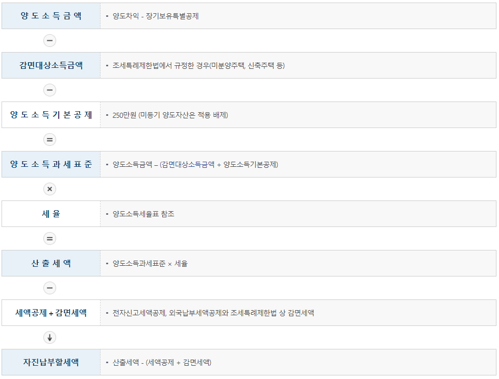 | 감면되는 경우 | 장기임대주택, 신축주택 취득, 공공사업용 토지, 8년 이상 자경농지 등의 경우 감면요건을 충족한 때에는 양도소득세가 감면됨 |