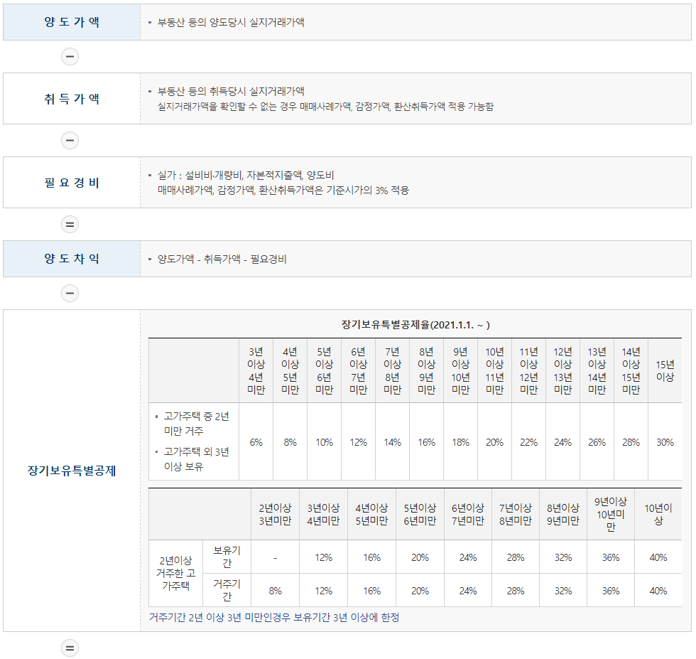 - 양도소득세는 과세대상 부동산 등의 취득일부터 양도일까지 보유기간 동안 발생된 이익(소득)에 대하여 일시에 양도시점에 과세