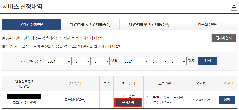 - 서비스 신청내역 확인 후 "문서출력" 버튼 클릭