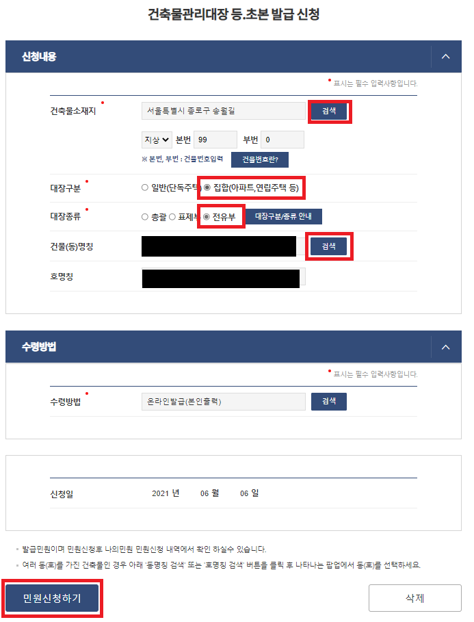 - "신청내용" 및 "집합 건물" 정보 입력 후, "민원신청하기" 버튼 클릭