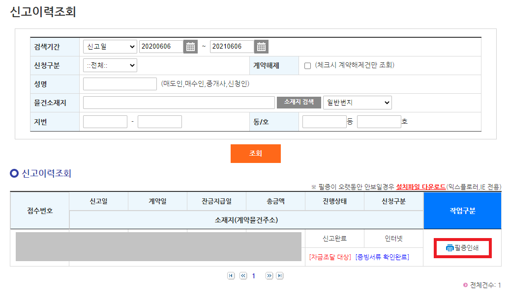- 계약일 이후 현재까지를 검색기간으로 선택한 후, 필요 정보 기입 후 조회