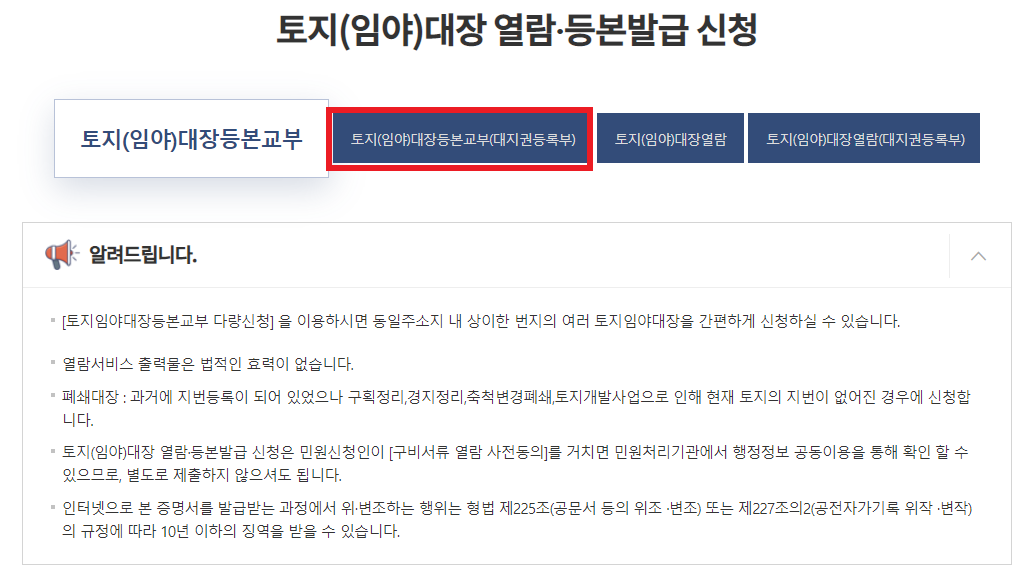 - 토지(임야)대장등본교부(대지권등록부) 선택