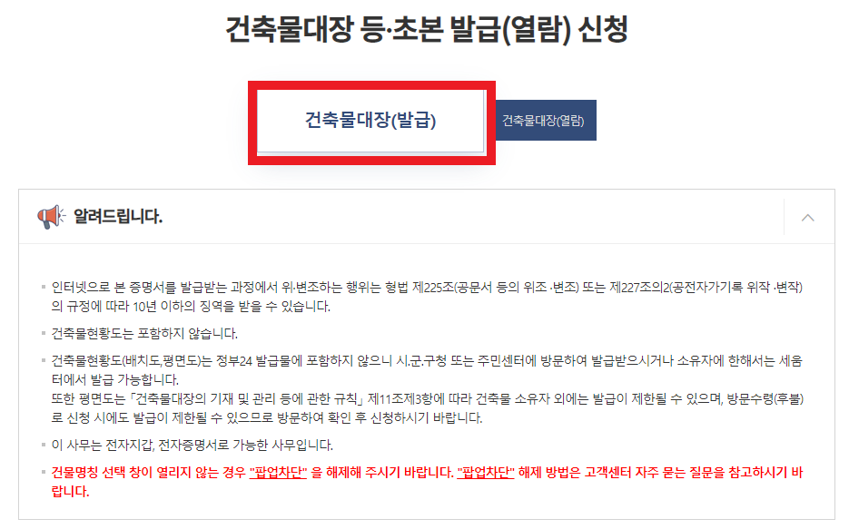 - 자주 찾는 서비스에서 「건축물대장」을 선택한다. (혹은 통합검색 창에서 건축물대장을 검색)