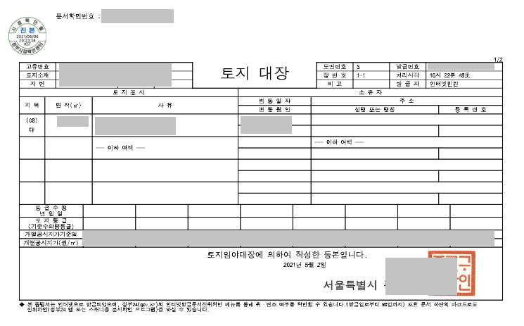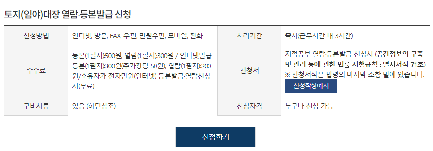 - 정부24 (www.gov.kr) 무료 발급 ☞ 바로가기 : 토지(임야)대장 열람·등본발급 신청 | 민원안내 및 신청 | 민원24 | 정부24 (gov.kr)