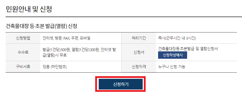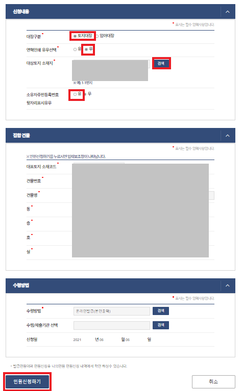 - "신청내용" 및 "집합 건물" 정보 입력 후, "민원신청하기" 버튼 클릭