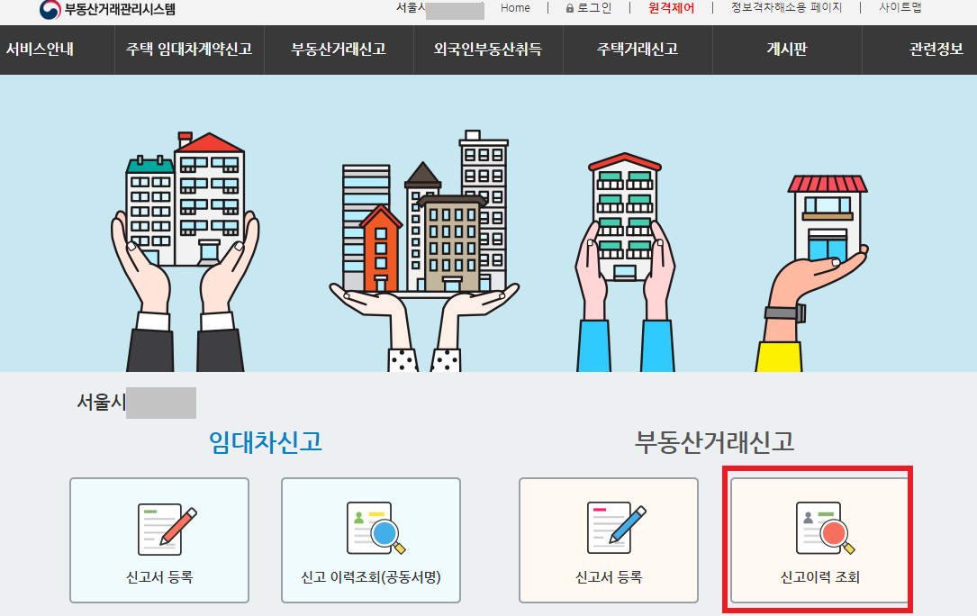 - 부동산거래신고 > "신고이력 조회" 를 클릭