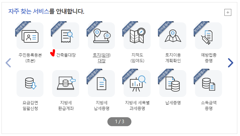 - 자주 찾는 서비스에서 「건축물대장」을 선택한다. (혹은 통합검색 창에서 건축물대장을 검색)
