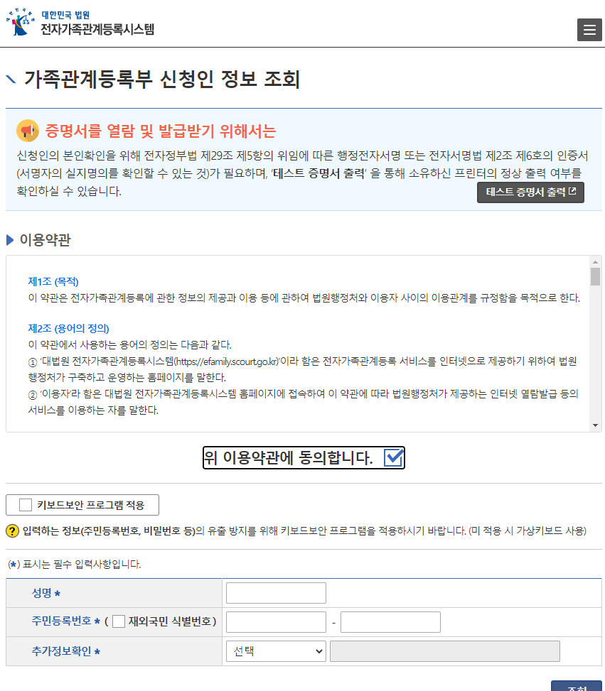 - 전자가족관계등록시스템 (https://efamily.scourt.go.kr/) 무료 발급 ☞ 바로가기 : https://efamily.scourt.go.kr/pt/PtFrrpApplrInfoInqW.do?menuFg=02