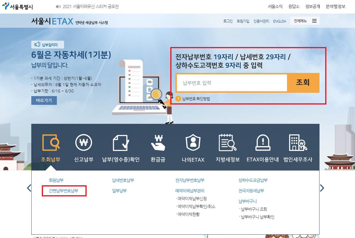 - "간편납부번호납부" 메뉴 선택 (or) 메인 화면에서 납부번호 입력 후 "조회" 버튼 클릭