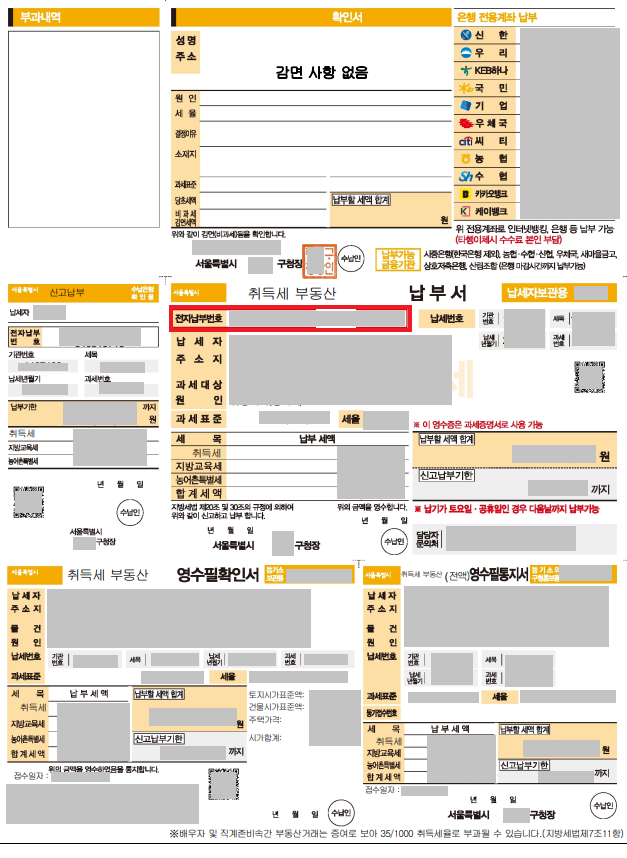 위의 서류를 준비해서 관할구청 세무과를 방문하여 취득세 신고를 완료하면 아래와 같이 "전자납부번호"가 기재된 취득세 납부 고지서를 발급받을 수 있다.