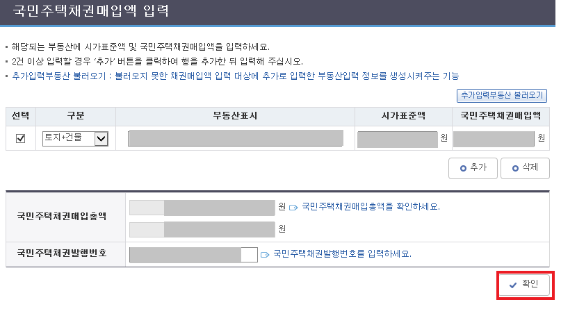 - 시가표준액 및 국민주택채권 매입 금액 : [국민주택채권매입액 입력] 버튼 클릭 후 입력