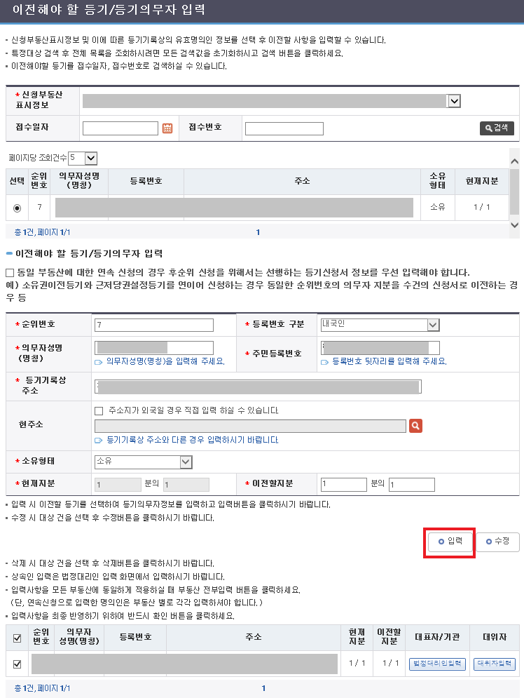 - 이전해야 할 등기/등기의무자 입력
