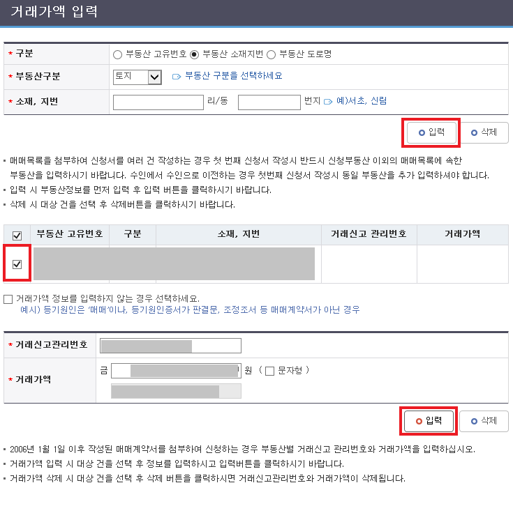 - 거래가액 입력 : 매매 대상 부동산 정보 및 거래가액 입력 후 "입력" 버튼 클릭