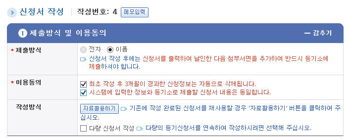 여기까지 필요한 서류 준비 및 등기 신청 서류 작성을 모두 완료했다.