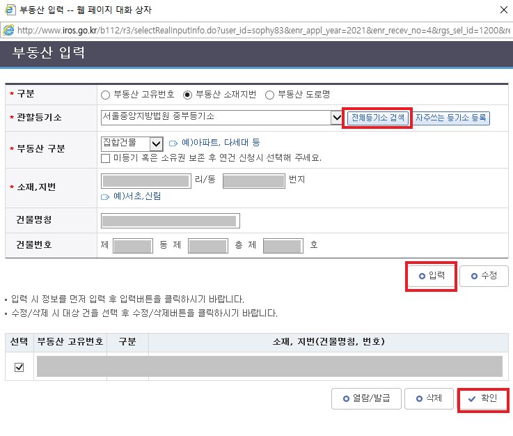 - 부동산 입력 : 부동산 정보 입력 후 "입력" 버튼 클릭 > 하단 목록에서 선택[V] 후 "확인"