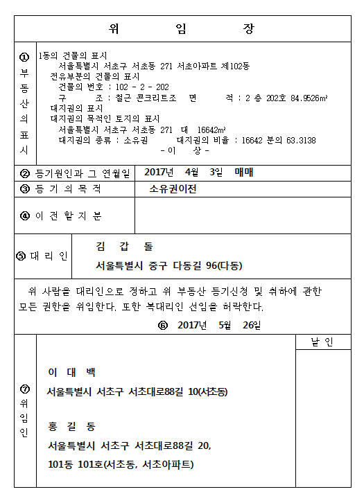 - 위임장 샘플 (※ 매도인이 공동명의 일 경우, 한 장에 두명의 위임인 정보를 입력 가능. 즉, 두명의 위임인을 1명의 대리인으로 매핑하여 한장의 위임장 서류 제출로 처리 가능)