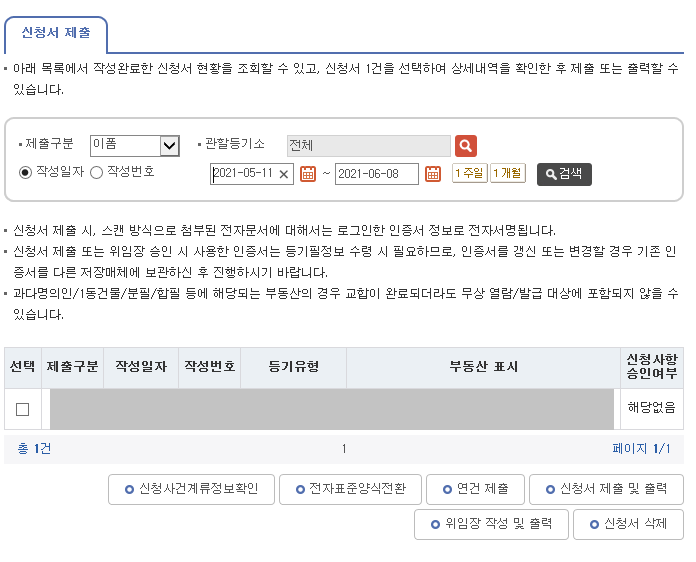 여기까지 필요한 서류 준비 및 등기 신청 서류 작성을 모두 완료했다.