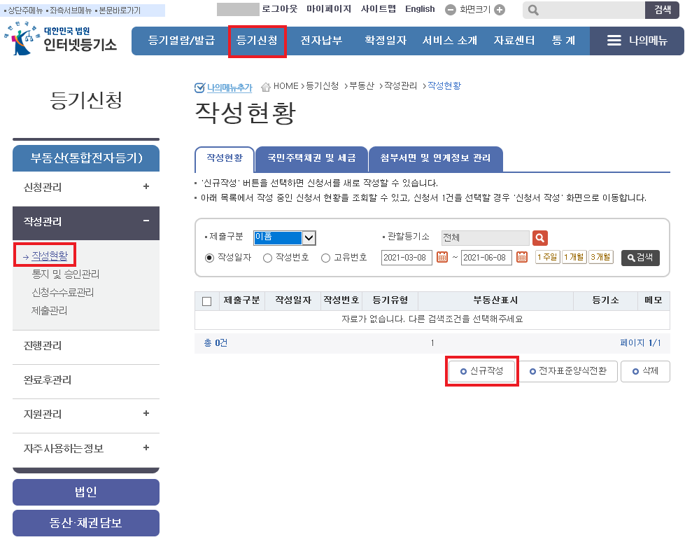 - 인터넷등기소 (www.iros.go.kr) 접속 > 등기신청 > 작성관리 > 작성현황 메뉴로 들어간다.