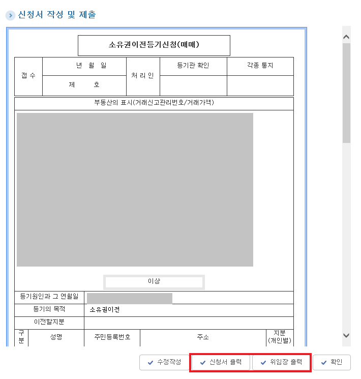 - 팝업되는 "소유권이전등기신청(매매)"에서 위에서 입력한 정보들이 제대로 입력되었는지 확인 후 출력한다.