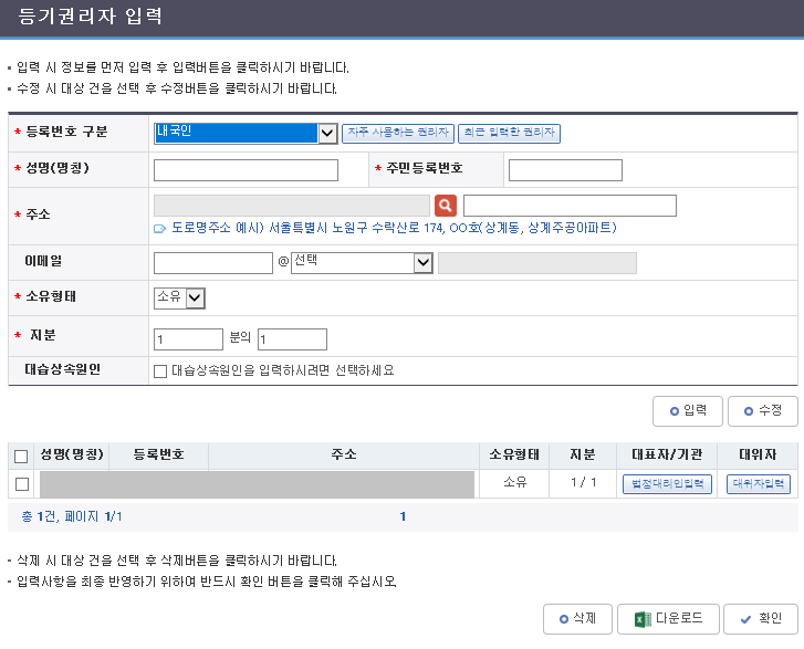 - 등기권리자 입력 : 성명, 주민등록번호, 주소, 소유형태, 지분을 입력한 후 "확인" 버튼 클릭