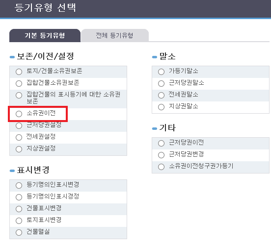 - 신청등기유형 : 보존/이전/설정 탭에 있는 "소유권이전" 선택