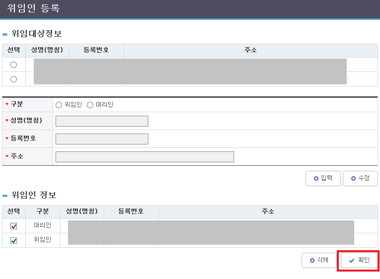 - [위임장 출력] 버튼을 클릭 > 팝업되는 화면에서 "위임인/대리인" 정보 등록 후 "확인" 버튼 클릭