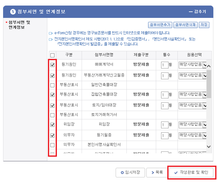 - 제출할 첨부 서면에 체크[V]한 후, [작성완료 및 확인] 버튼을 클릭한다.