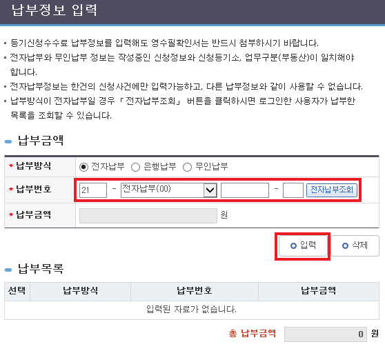 - 등기수수료 : [납부정보] 버튼 클릭 후 입력